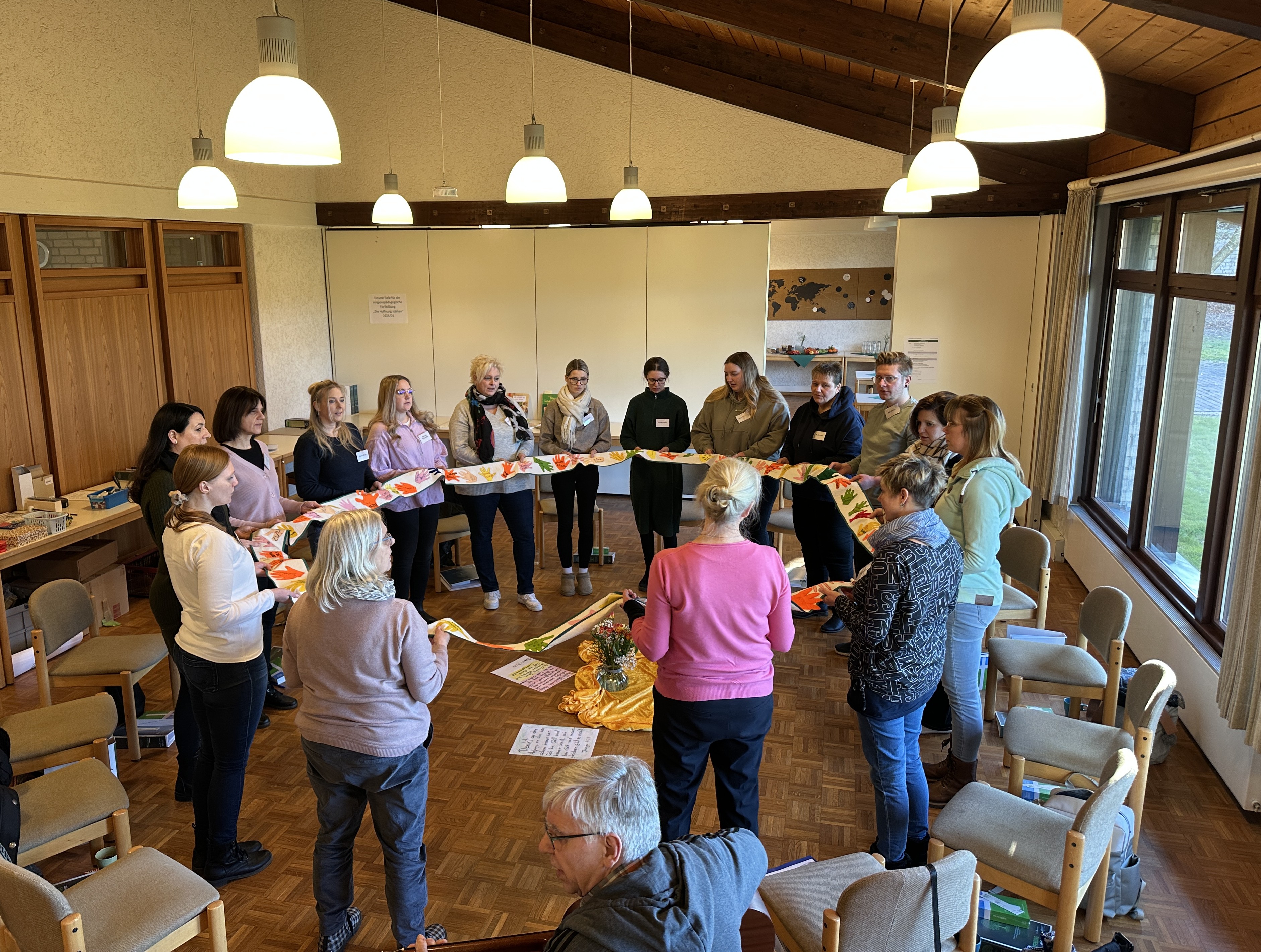Die Teilnehmerinnen und Teilnehmer bekommen Material an die Hand, wie zum Beispiel die Basisbibel oder Ordner mit Anleitungen für die praktische Arbeit in der Kita. Sie befassen sich mit dem Kirchenjahr, Ritualen, Bekenntnissen und Gebeten. Die Bibel und Kirchen werden erkundet, es gibt Austausch und Gemeinschaft. Diese wird gleich zum Auftakt thematisiert, indem sich alle im Kreis aufstellen und sich über ein Band, das alle in die Hand nehmen, verbinden.